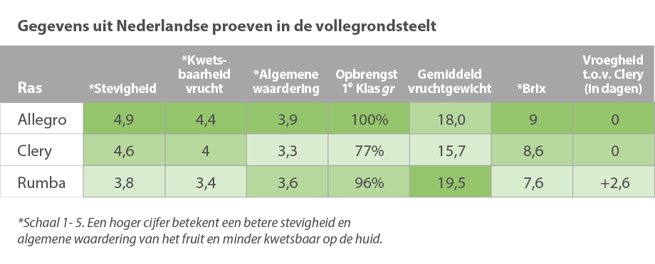 De opbrengst van Allegro is zeer hoog, de klasse 1 opbrengst ligt gemiddeld 20% hoger dan Clery in onze vollegrondsproeven. De vruchtmaat is gemiddeld groter en stabieler dan Clery, wat vooral tot uiting komt in de tweede helft van de oogstperiode.